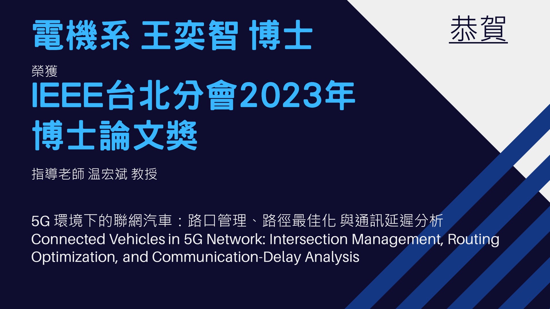 恭喜温宏斌教授指導學生王奕智 榮獲IEEE台北分會 2023年博士論文獎